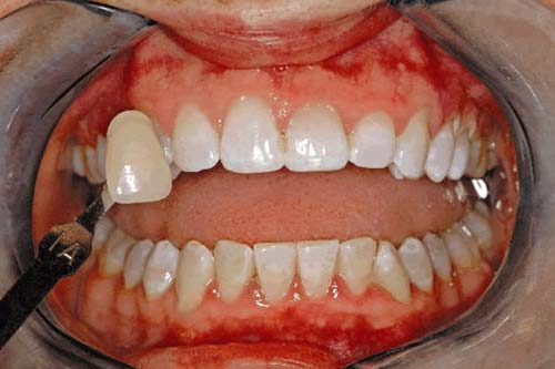 - Preparation - We start the whitening process by covering your lips and gums leaving only your teeth exposed. At this time, we can usually estimate how white your new smile will be by matching your teeth with a whitening shade and estimate approximately up to 8 shades whiter from here.