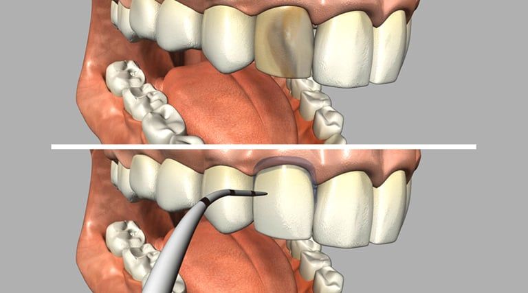 1. We start the crown procedure by reducing the overall size of the tooth that's in need of a dental crown. Shaving off existing tooth structure allows for the new crown to fit properly and it also creates a foundation for the new crown to be bonded to.